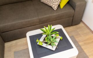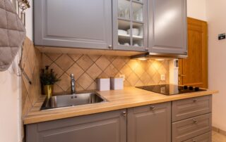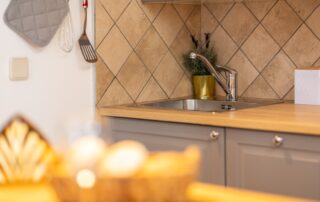 Utensils for preparing and serving food and drinks, and cutlery in appropriate quantities, refrigerator with freezer, stove, coffee machine, dishwasher, kettle, toaster, microwave, sofa bed for 1 person