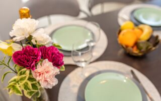 Utensils for preparing and serving food and drinks, and cutlery in appropriate quantities, refrigerator with freezer, oven, stove, coffee machine, dishwasher, kettle, toaster, microwave