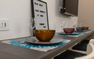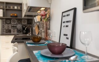 Utensils for preparing and serving food and drinks, and cutlery in appropriate quantities, refrigerator with freezer, oven, stove, coffee machine, dishwasher, kettle, toaster, microwave.